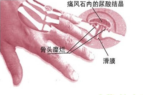 在这个阶段的患者,发病时多关节疼痛,且时程会延长许多。过多的尿酸盐结晶,使得身体各关节及其周边组织出现“痛风石”,进而造成关节变形。此外,尿酸盐结晶也会逐渐沉积在肾脏、尿路及皮下等处,从而形成脏器结石,对人体多器官甚至是心理造成严重影响。